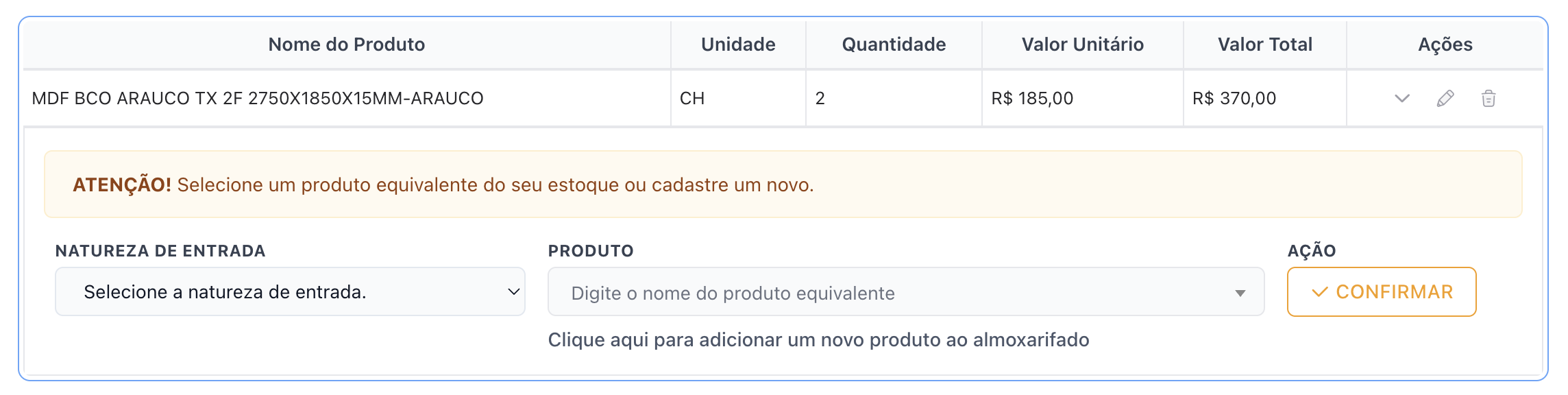 Se é um produto novo que não existe no almoxarifado: