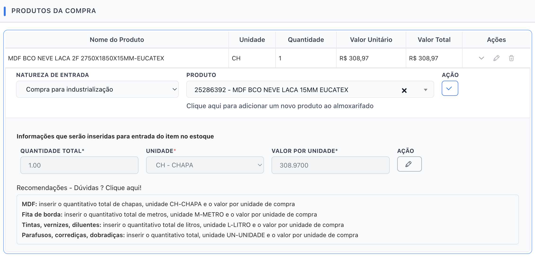 Dica: Para chapas e materiais em metro linear/quadrado, preencha corretamente as dimensões para que o sistema calcule automaticamente a conversão.
