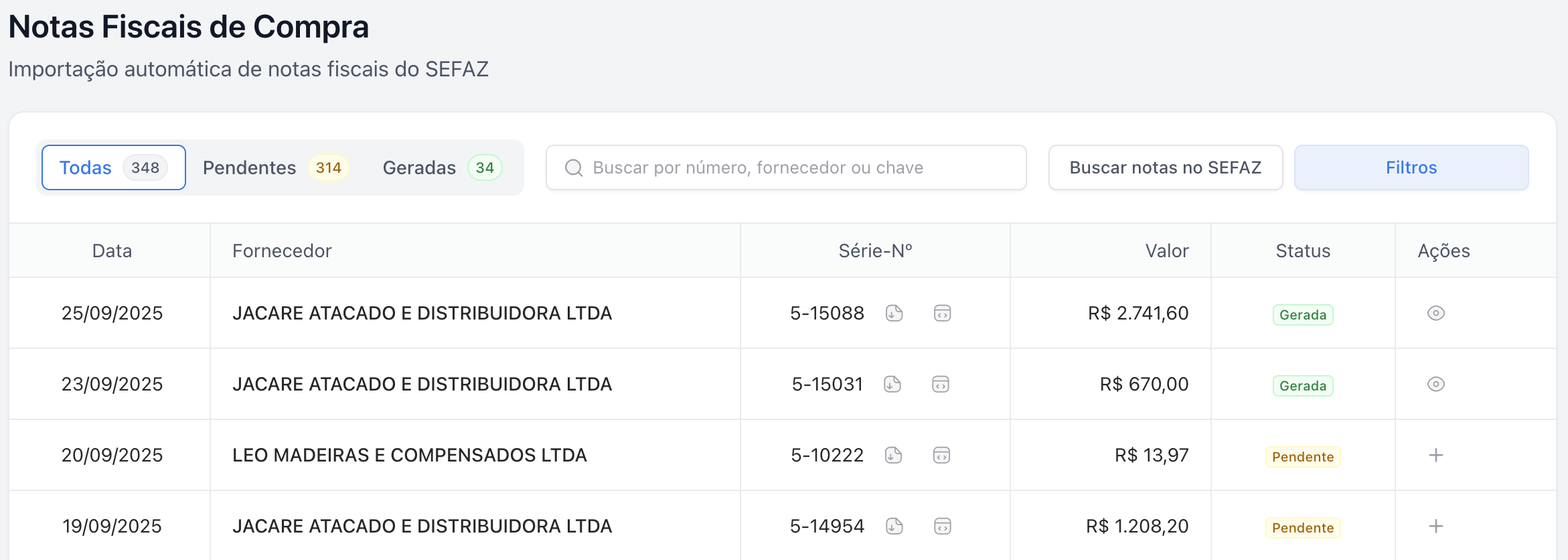 O Notas de Compra é a tela do sismarcenaria onde você visualiza todas as notas fiscais de compra emitidas contra o CNPJ da sua empresa. É o ponto de partida para criar pedidos de compra importados automaticamente.